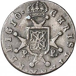 -Reverso: Escudo coronado de Navarra, P en ambos lados; "RELIGIO · CHRISTIANA · ". |
